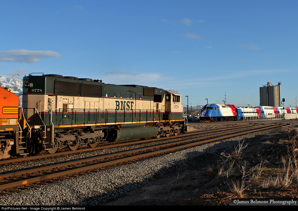 A BNSF Railway trackage rights train roars east on the UP with 76 cars, meeting a UTA FrontRunner commute at Vine Street crossing in Murray. The 9778 is an SD70MAC, built new for the BNSF in March 1997. More than 1500 total SD70MAC units were built by EMD for the Burlington Northern/BNSF, Conrail, CSX, TFM/KCS and the Alaska Railroad. In 2004, the model was replaced by the SD70ACe with upgrades that meet Tier-2 EPA regulations.