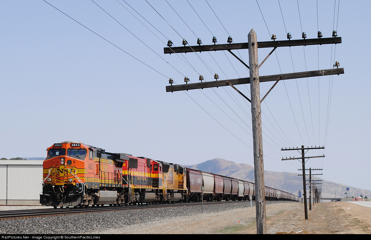 The old and the new. Three widecab locomotives, each belonging to a different road lead a BNSF hopper train through Tehachapi, passing the old code line poles, soon to be removed.