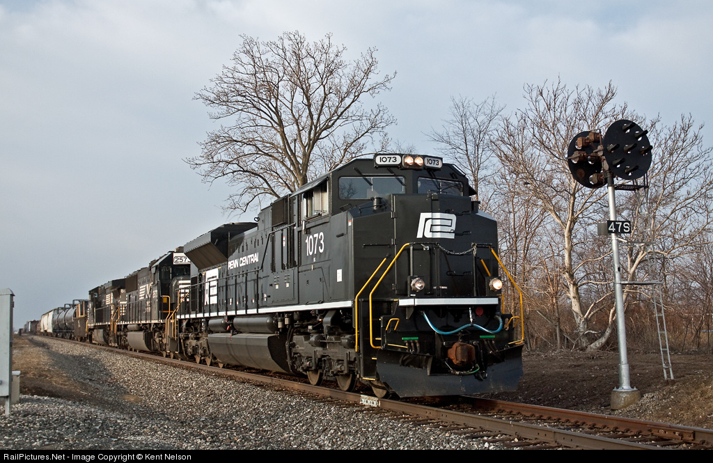 NS Penn Central heritage 1073 leads 142 north past the PRR position light signal at Bolivar, Indiana at mp 47.