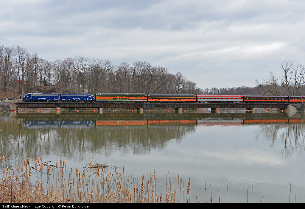 An High Iron Travel special excursion operated from Boston, Massachusetts to Mechanicville, New York on Saturday, April 13, utilizing Pan Am Railway's pair of FP9s - PAR-1 and PAR-2 - with Iowa Pacific Holdings-owned passenger equipment. Casting a decent reflection on a still Hoosic River, the train rolls through Schaghticoke, NY.