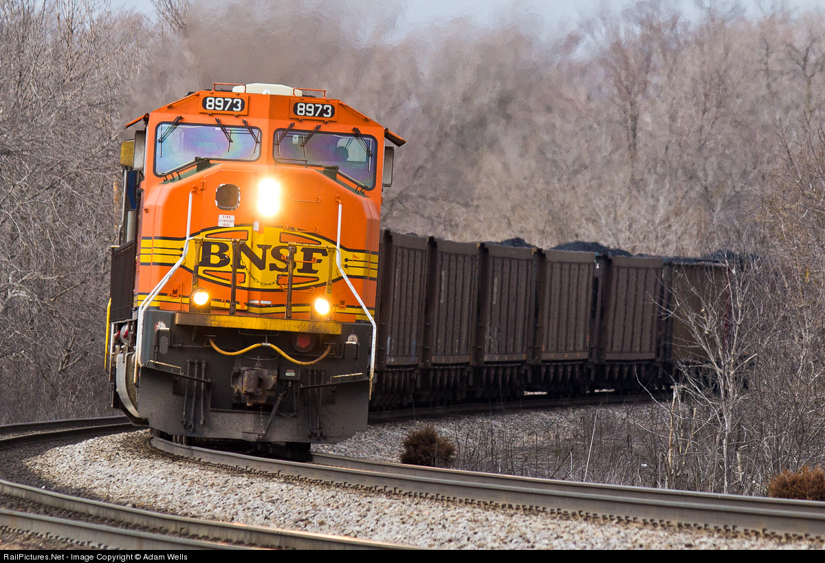 | An all-AC power lash consisting of BNSF 8973 (SD70MAC) and CSX 337 (AC44CW), this loaded coke drag is bound for Fayette County, Indiana |