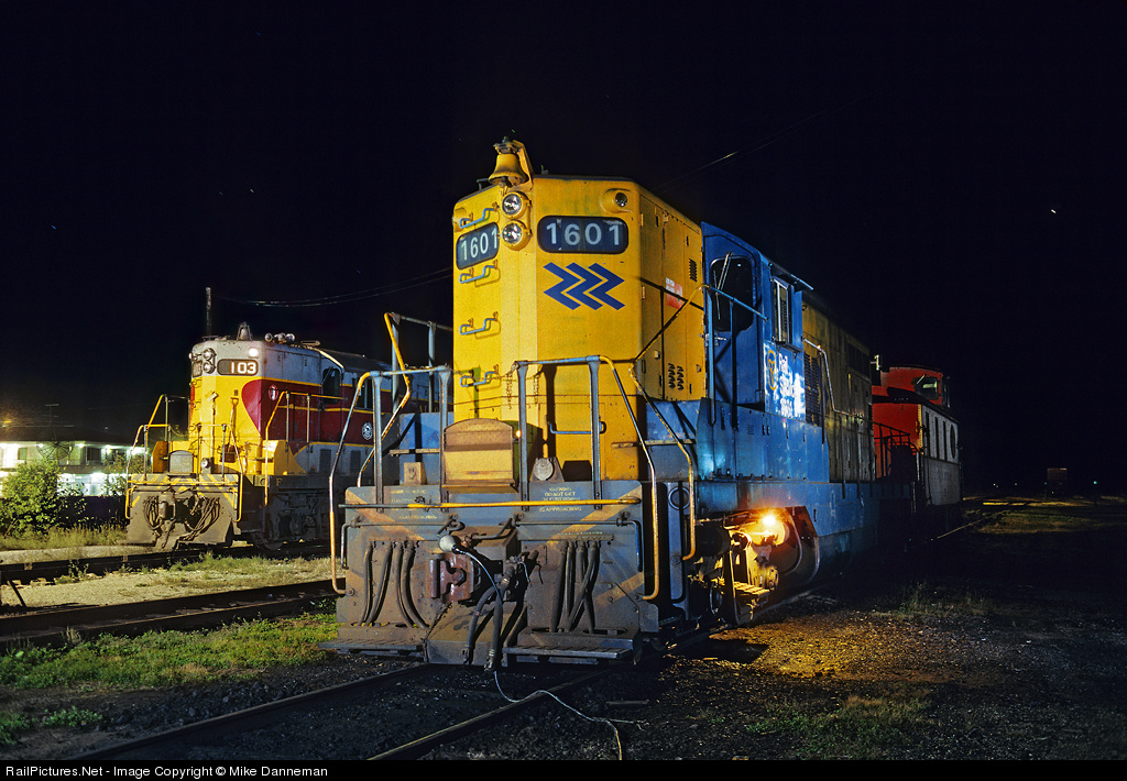 On the evening of September 19, 1993, power for Algoma Central and Ontario Northland slumber the night away at Hearst, Ontario. Algoma Central No. 103 is a GP7, while ONR No. 1601 is a GP9.