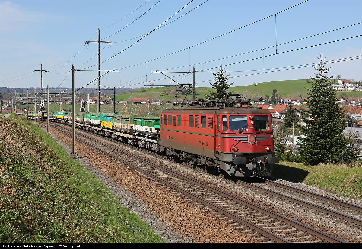 | Ae 6/6 # 11419 from 1958 is pulling train 69775 with empty excavation cars of Weiacher Kies AG, from Zweidlen to Zürich Vorbahnhof near Eglisau. |