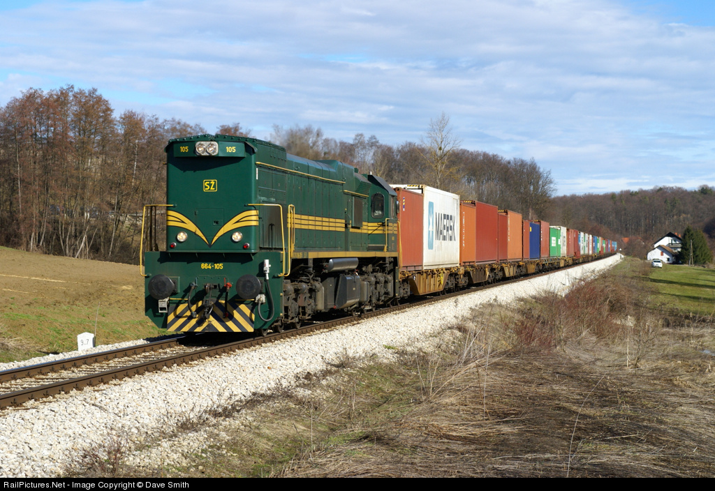 | SZs 664-105 seen with a liner from Hungary.These trains cross into Slovenia from the border station at Hodos . |