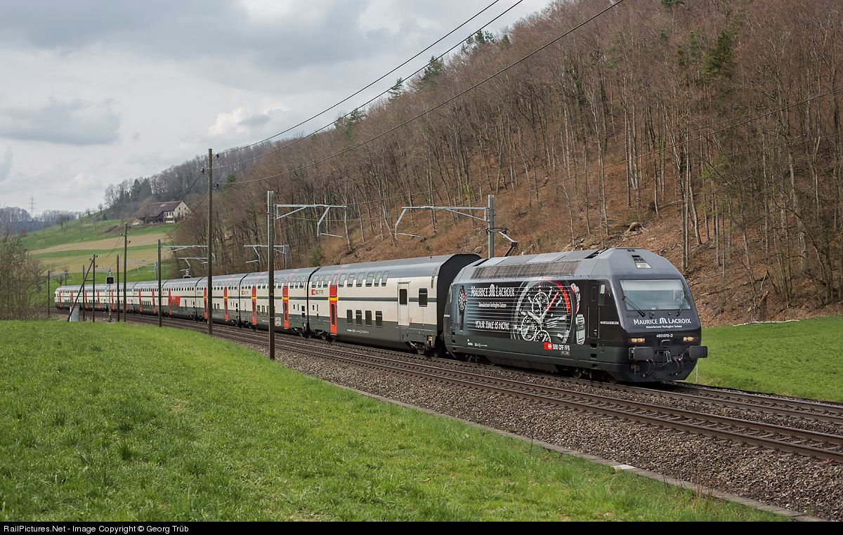 | Since a few days Re 460 076 has a new publicity paint scheme for the swiss watch manufacturer "Maurice Lacroix". The locomotive is pulling IC2000 push pull train Intercity 581 from Basel to Zürich. |