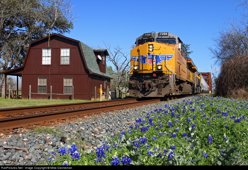 Sign of spring Crossing the Colorado River Bridge at Columbus, Texas; westbound Union Pacific MEWEG freight passes a bed of bluebonnets, the official State Flower. The owners of a rustic home next to the Sunset Route here sure have a good view of the trains, albeit a bit close when your watching TV or sleeping!