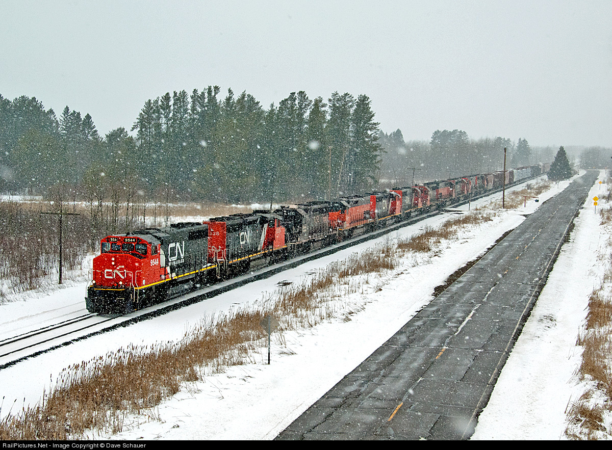 Snow falls as a healthy consist leads the MRF south towards Proctor (only two units on-line, the rest headed to Proctor for balance of power or repairs/inspections). Leading the train was CN GP40-2W 9544 followed by CN SD40-2W 5338, IC SD40-3 6252, B&LE SD40T-3 904, CN SD40-2W 5337, GTW SD40-2 5934, IC SD40-3 6263, B&LE SD40T-3 900, IC SD40-3 6264, DM&IR SD40-3 406 and CN SD40-2W 5287.