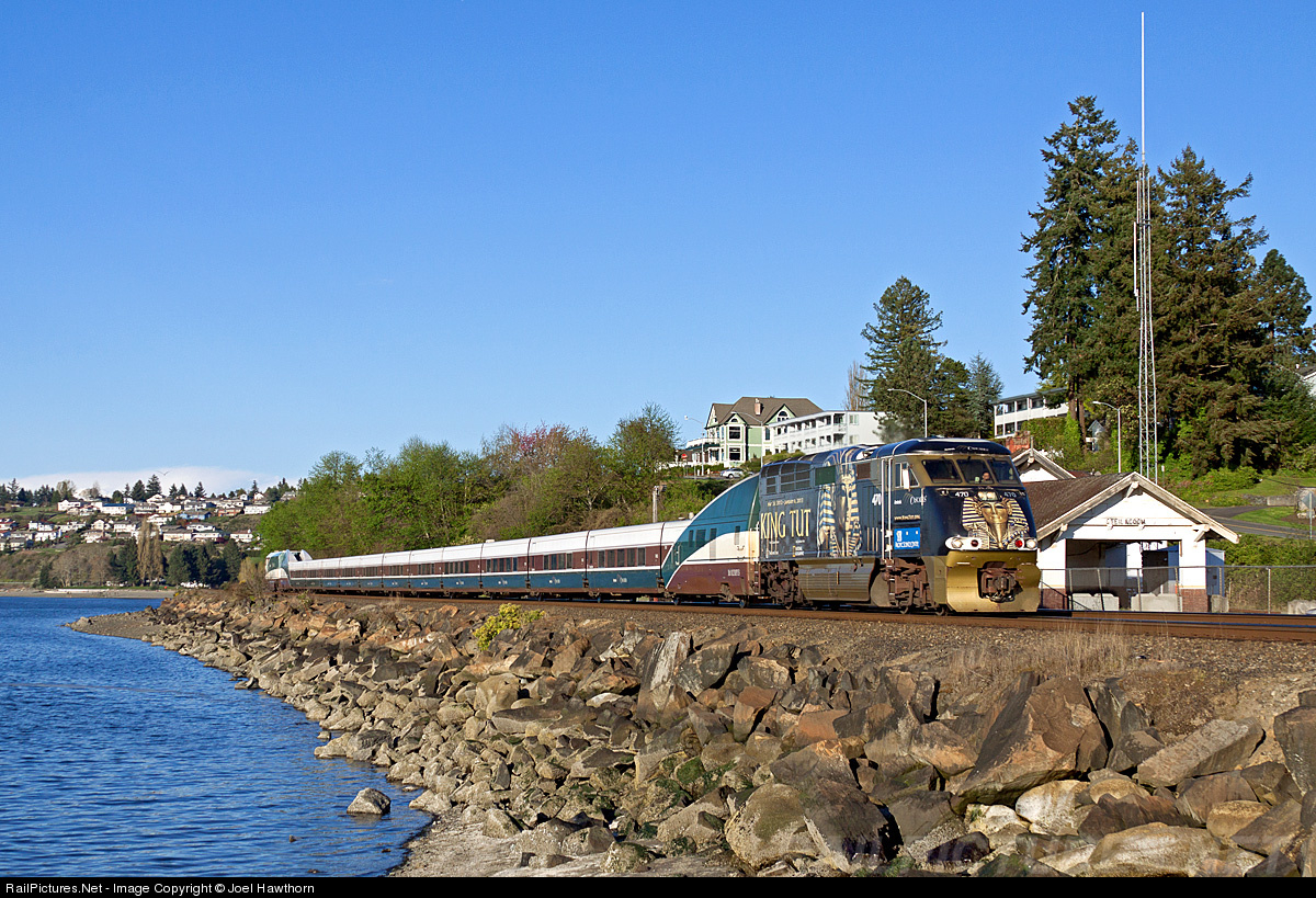 Engine 470, still wrapped in its King Tut livery, whisks the evening Amtrak Cascades train 509 southbound along Puget Sound where it passes the town's vacant and decaying 1914 vintage Northern Pacific depot.