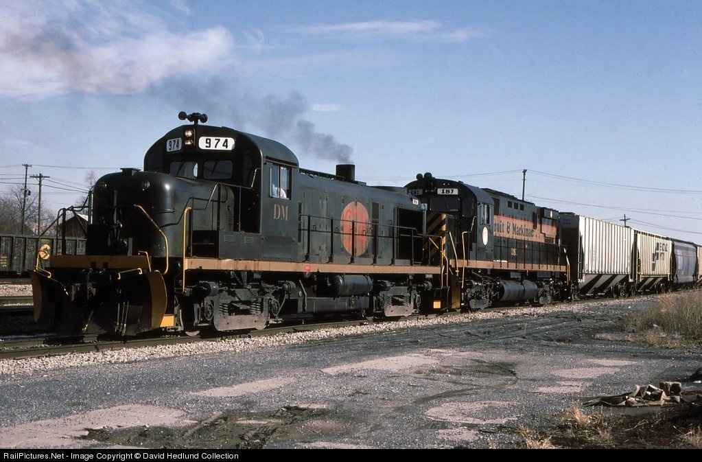 | Working on sister railroad Central Michigan, D&M RS-3u 974 & C425m 181 are shoving a 65 car unit grain train into CSX's yard. From my slide collection by an unknown photographer. |