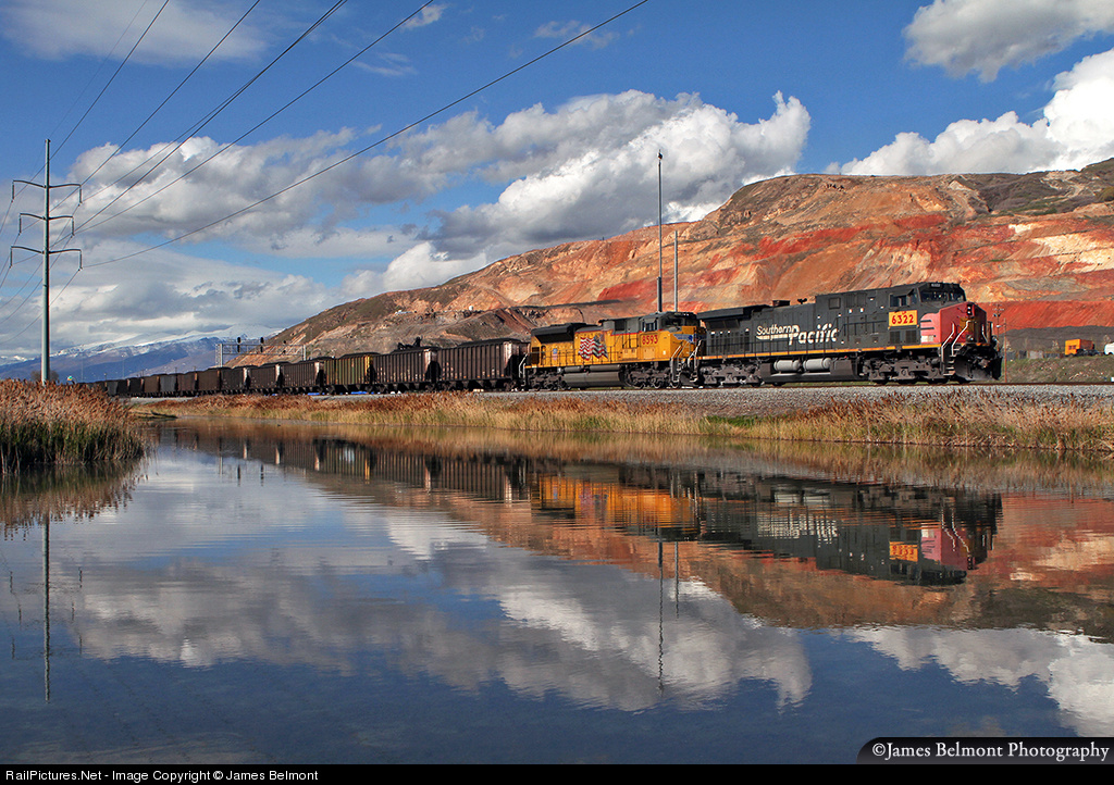 Union Pacific's Skyline, Utah to Cora, Illinois coal train glides east along the still waters of Becks Hot Springs in Salt Lake City. The UP 6322 was built the SP 299 in July 1995.