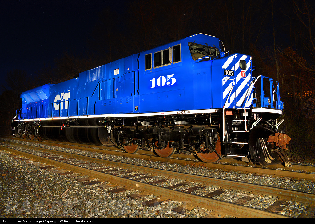 | Vermont Rail System has traded out CEFX (CIT) SD9043MACs, sending the CEFX 130 north to CAD in Lachine, Quebec, while in turn receiving the CEFX 105 FROM Lachine this week. The CEFX 105 in fresh blue CIT paint is seen on the controlled siding of the NECR Palmer Subdivision after acceptance for delivery by the Vermont Rail System. |