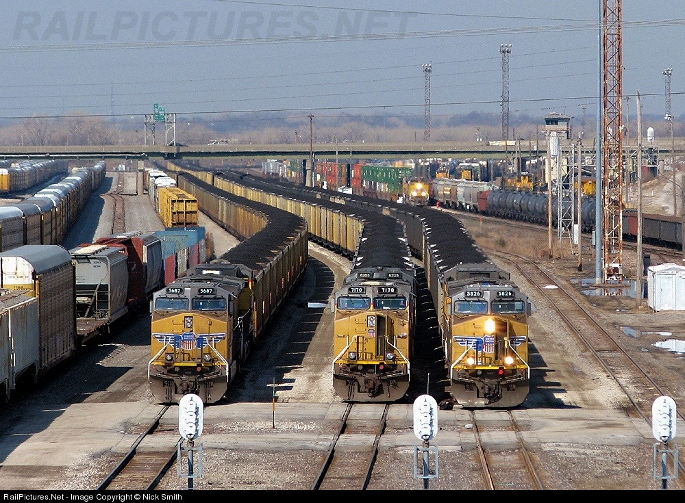 A trio of UP coal trains are staged at 18th St Yard as an intermodal train approaches in the distance.