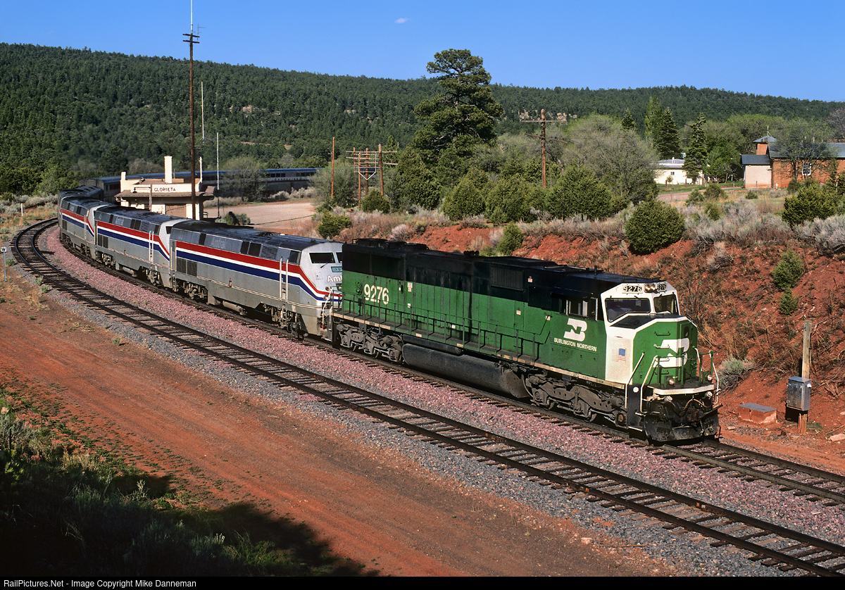 Amtrak No. 3, the Southwest Chief, is climbing Glorieta Pass at Glorieta, New Mexico, on May 20, 1999. Apparently some power issues further east on the trip has required the assistance of a Burlington Northern coal motor; EMD SD60M No. 9276 to be exact. Besides the 9276, four Amtrak P42DCs play follow the leader “elephant-style,” with Nos. 33, 45, 5 and 8 all tagging along on the 22-car train.