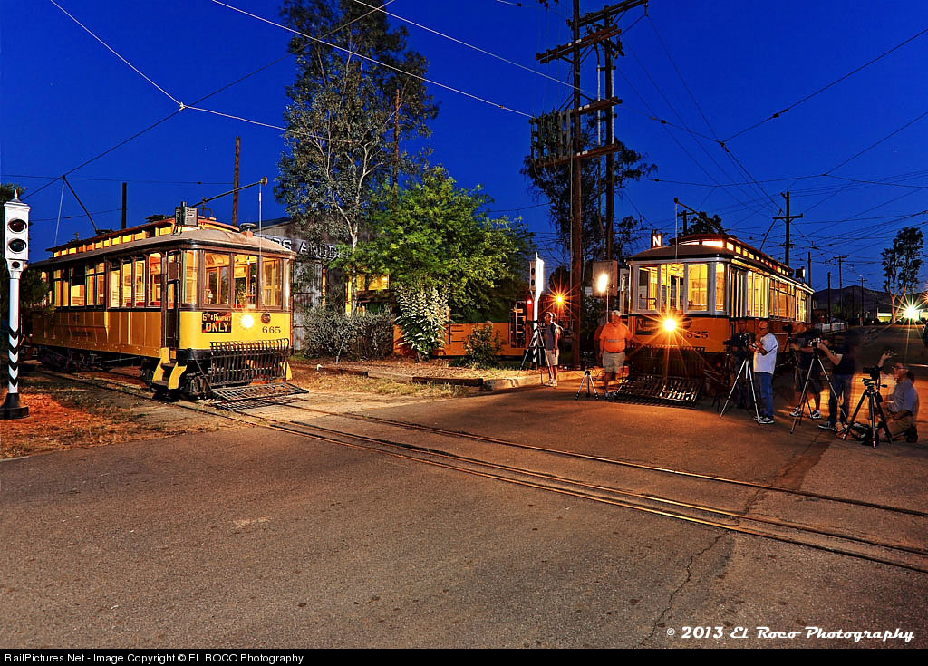 In this image, the group is photographing Los Angeles Railway Car #665 (on the left) using both ambient light and a number of high powered strobe lights that have been placed around the car to provide additional light.