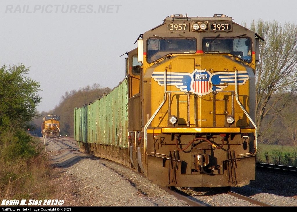 Two Union Pacific work trains sit quietly in the siding at Joan where a 38 car derailment happened on the South end of the siding which can faintly be seen in the back ground. Both trains will assist in the clean up on 4-22-2013 outside the town of Livingston, Illinois.