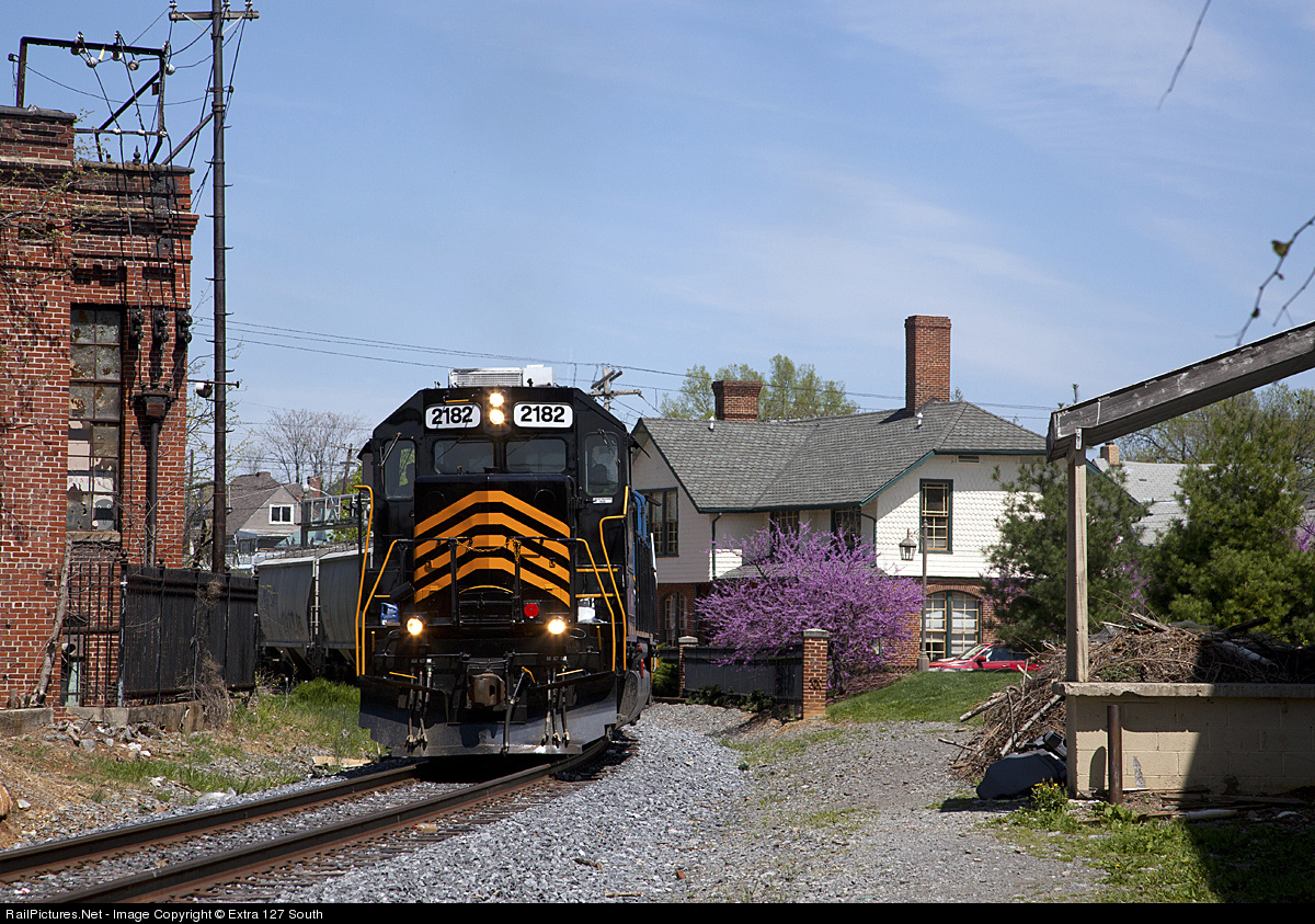 W&W GP38-2 No. 2182 leads a southbound freight past the former Cumberland Valley Railroad station as it eases its train through an industrial area in Martinsburg, WV on April 21, 2013.
