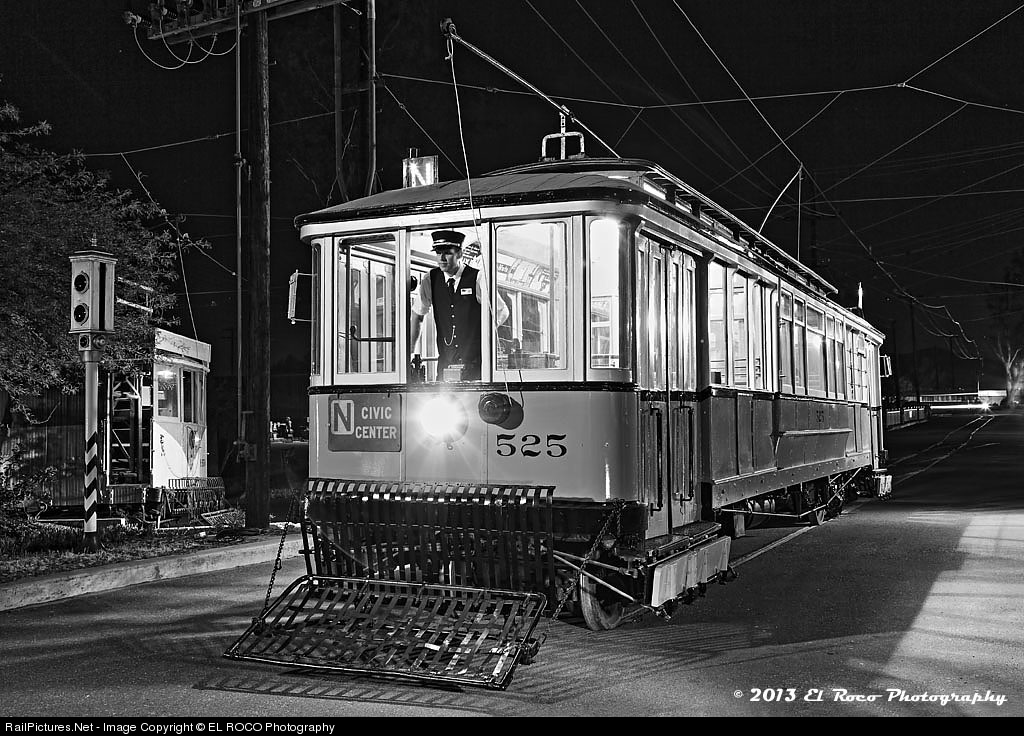 Los Angeles Railway Car #525 B&W Version [OERM Collection] - David, the volunteer motorman for our night photography seminar put on by Steve Crise at the Orange Empire Rail Museum operates Los Angeles Railway Car #525 and prepares to set it for a reverse movement back up the street, while L.A. Railway Car #3100 makes the turn toward the shop area in the background. A special thanks to Steve Crise for his time, expertise and the use of his equipment, without which this image would have looked very different.