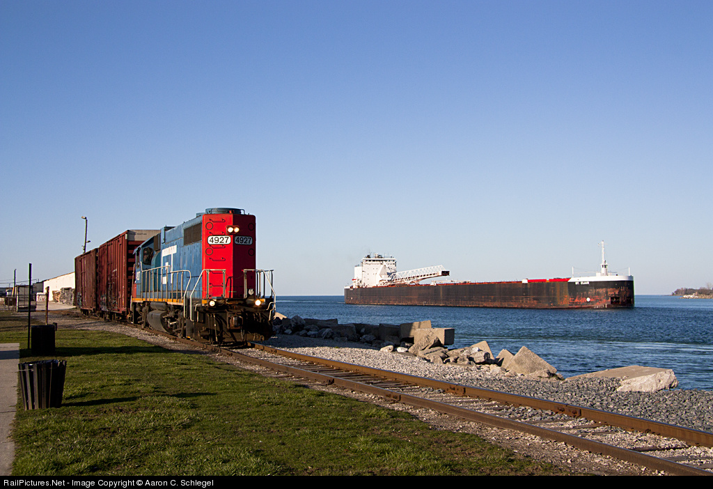 Two EMD's meet as the Lake Freighter St. Clair enters the St. Clair river in Port Huron, Mi just as the GTW 4927 pulls cars from the Dunn Paper company at the mouth of the river. The GTW 4927, powered by a single EMD 2000 HP, 16cyl engine is dwarfed by the 10,800 HP of the St. Clair that is derived from Three EMD V-20's built by the Electro-Motive Division of General Motors Corp., La Grange, IL.