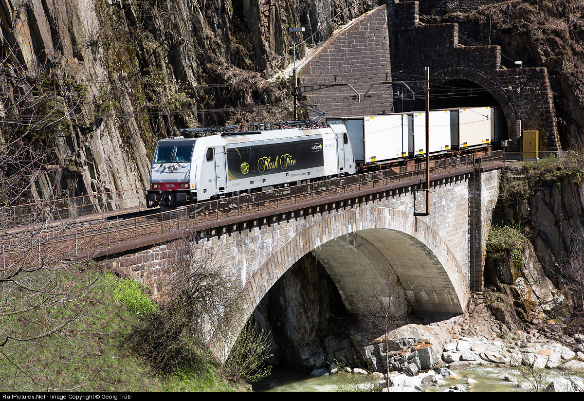 | RailCare company is a new player on the Gotthard line since change of timetable in december 2012, with a daily train between Mendrisio/Castione and Oensingen and vice versa, transporting swap bodies. Locomotive 186 104 "Flash Fire" leased from Railpool on the lower Wattinger bridge. |