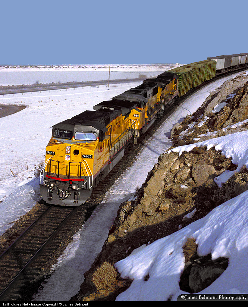 The NPLAT, one of the hottest trains on the UP at the time, heads west along the Lynndyl Sub at Lake Point, Utah. In the background, the Great Salt Lake is cloaked in fog while along the shoreline, the former Western Pacific Railroad and Interstate 80 point west toward northern Nevada and California. Note the trio of green HOGX 'Farmer John' stock cars behind the power.