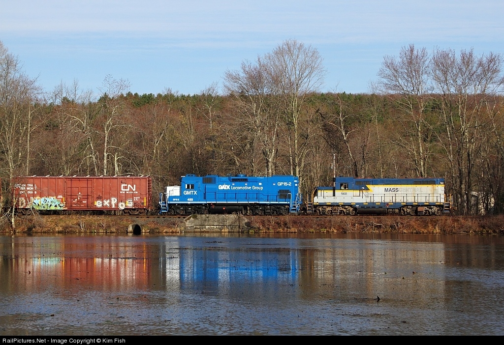 Macc Central train PA-2 passes Crystal Lake in Palmer, Ma in the early morning hours of April 25, 2013 with newly aquired GP15-2 GMTX 499 in consist. This unit is on a 30 day trial/lease to Mass Central while the railroad does some work on there fleet.