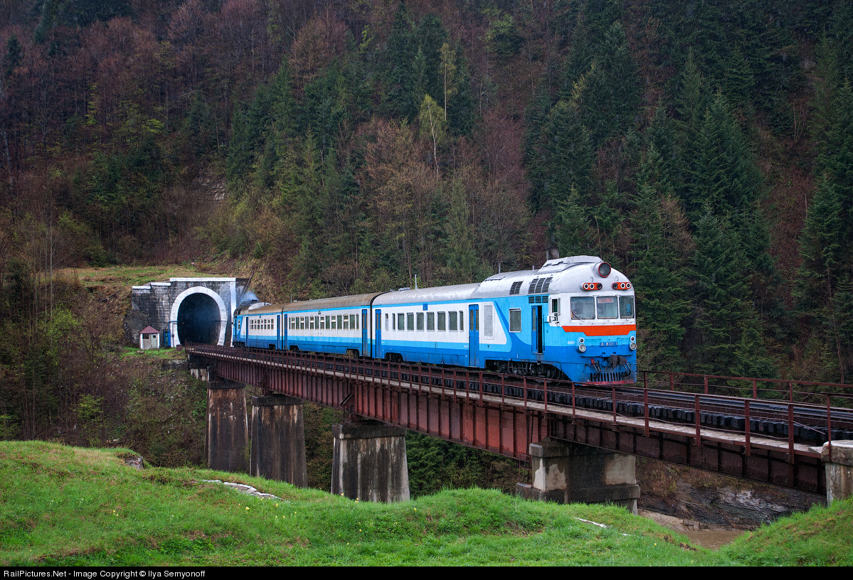 D1 diesel multiple unit with suburban train follows on the bridge over the river "Prut" in Carpathian Mountains near Yaremche station. Railroad "Deliatin - Voronenko" built by Austria-Hungary Empire in the second half of the 19th century. This railroad is on of the most picturesque on the territory of former USSR and is rich in complex of engineering structures. At the beginning of 21s century there were held many steam locomotive tours here.