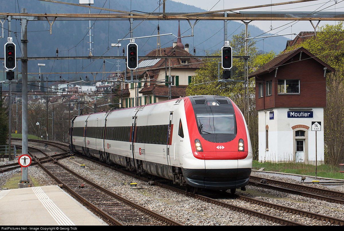 | Tilting train RABDe 500 006 "Johanna Spyri" in the new paint scheme after revision on a test run entering moutier station. The signal box isn't active anymore. |
