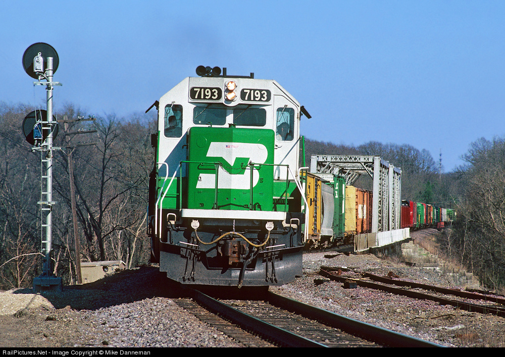 Burlington Northern train 103 crosses the Rock River Bridge at Oregon, Illinois, on the nice spring day of April 6, 1991. On this day, the train was restricted to 35 mph, making for a nice chase, and we followed 103 the rest of the afternoon until the last shot at Savanna during sunset.