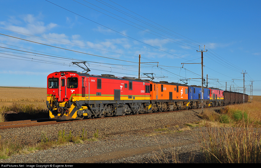 The bright morning sun highlights this colourful lash-up of four clean class 10E1's, working a 100 wagon coal train from the Witbank coalfields to Ermelo, on the 3kV DC section of the CoalLink line. In Ermelo yard, two of these 100 wagon trains will be combined into one 200 wagon train, to continue the journey to Richards Bay with 25kV AC power.