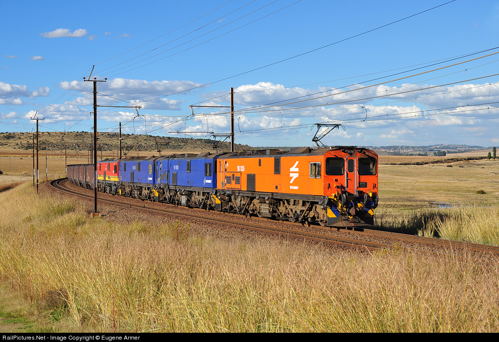 On a beautiful autumn afternoon, four class 10E1 3kV DC Co-Co locomotives, led by 10-135 in Spoornet orange livery, climb the long grade out of the valley west of Ermelo, with a 100 wagon train of coal empties returning to one of the mines around Witbank. The town of Ermelo is visible on the horizon, just ahead of the lead locomotive.