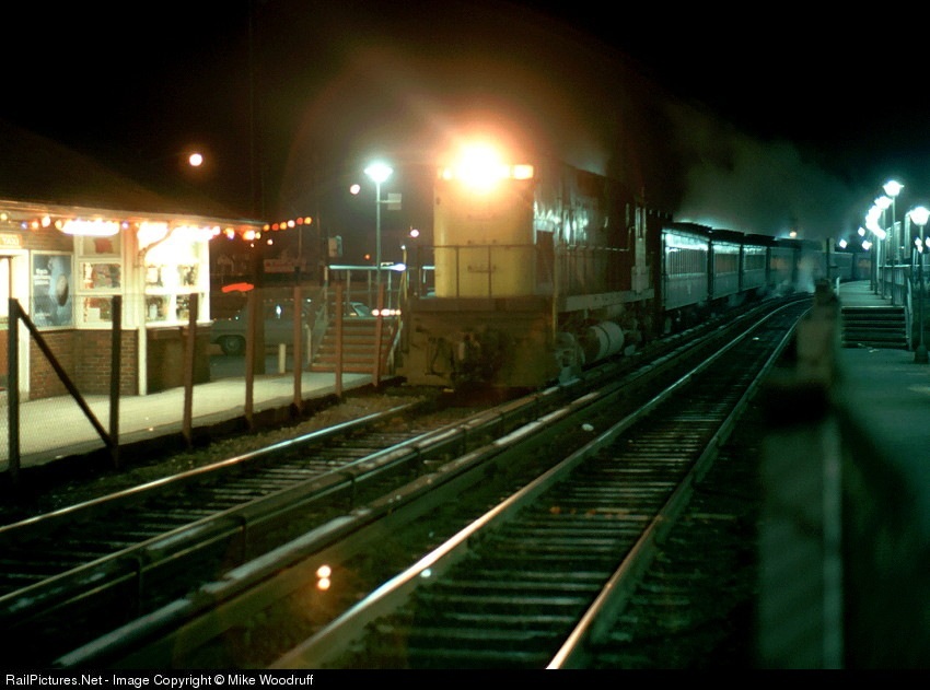 A C420 and a string of "ping pong" MP54 coaches pauses at the Syosset depot on a cold night in December, just before Christmas, 1971. Kodachrome II, Argus C-3 "brick" balanced on a fencepost.