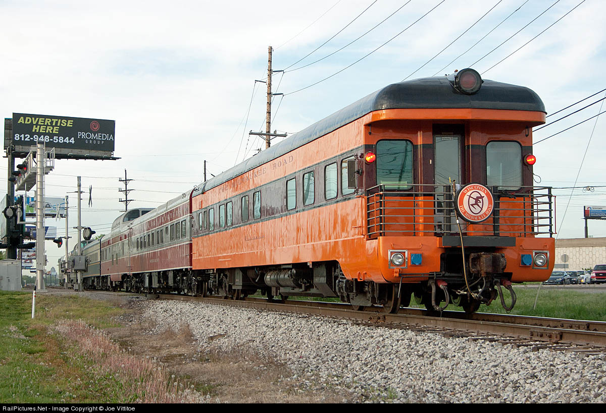After traveling south down the LIRC Amtrak's Kentucky Derby charter special has arrived in Jeffersonville. Bringing up the back end is Milwaukee Roads observation car Wisconsin.