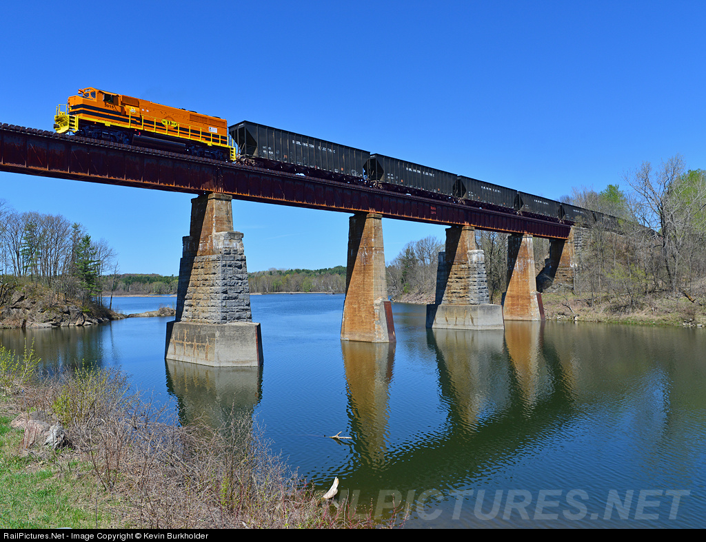 | Fresh out of the paint booth, New England Central GP40-2CU (GWI's designation of the unit - GP40-2W for the purists) 3015 is seen high above the Lamoille River on the Georgia High Bridge with Friday morning's Burlington Electric Chip train. The 3015 was formerly the RMPX 9457 in faded and tattered CN paint. More photos of the NECR chip trains and a guide for Chasing the Chips will appear in the June issue of Eastern Railroad News (http://www.easternrailroadnews.com) |