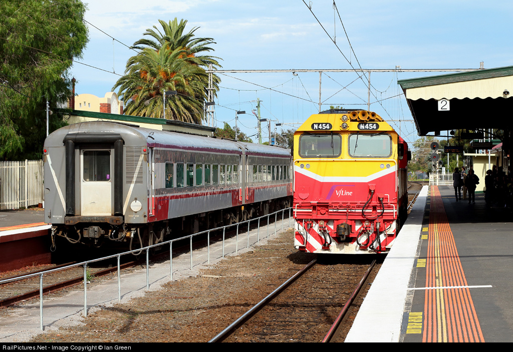 | Prior to forming the 1.30pm down Bairnsdale pass from Southern Cross, N454 runs around the empty cars at Essendon Station. |