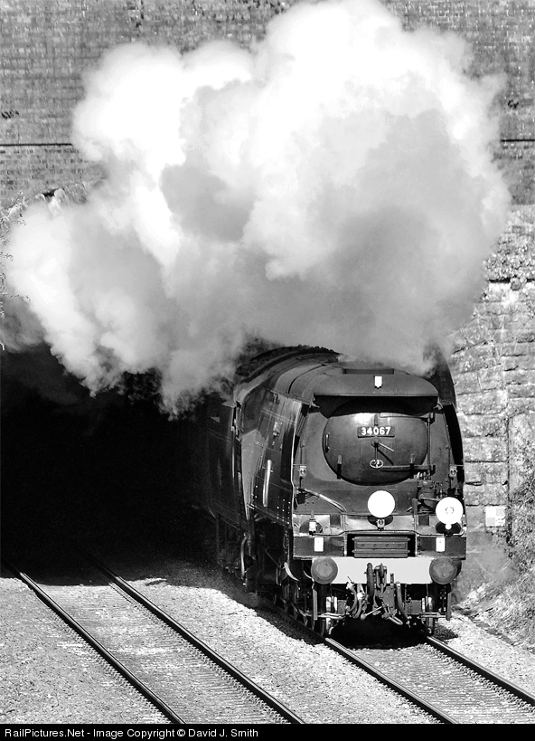 | Bulleid "Battle Of Britain" Pacific 34067 "Tangmere" erupts from Sapperton Tunnel whilst working a railtour on the Gloucester to Swindon "Golden Valley" route. |