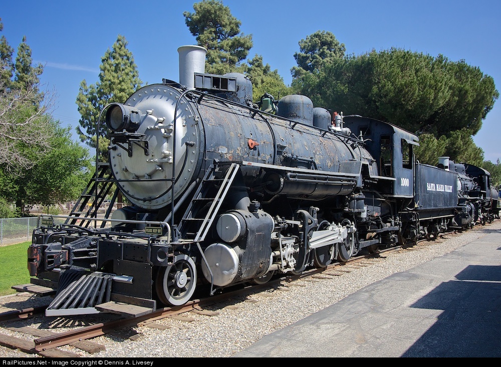 Santa Maria Valley No. 1000 was built in 1920 by American Locomotive Company for the Hetch Hetchy Railroad #4. This 2-8-2 Mikado has 20 x 28 cylinders, 48-inch drivers, weighs 88 tons and has an overall length of 79 feet 10 inches. As such it helped build the dam that now waters San Francisco. In 1924 when HHRR sold five engines No. 4 went to the Newaukum Valley Railroad in Washington where it was renumbered No.1000. In 1944 it was sold to the Santa Maria Valley Railroad where it hauled petroleum and agricultural products. The June 2013 of Trains Magazine has an excellent article by Tom Murray on the present day Santa Maria Valley. In 1958 No. 1000 was donated to the Travel Town museum in Los Angeles, California.