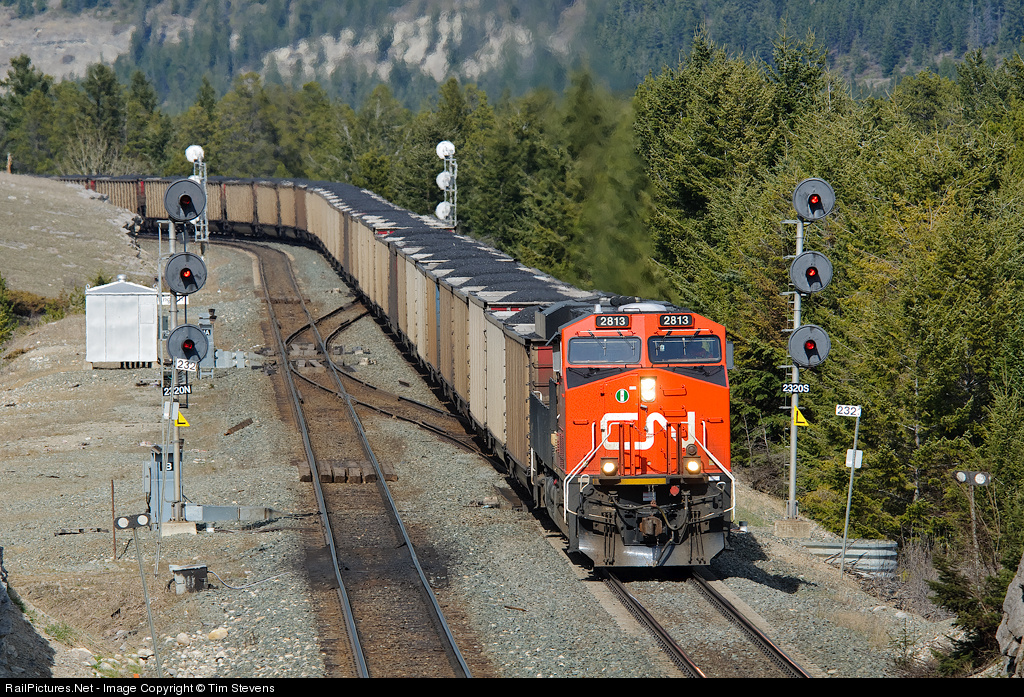 CN ES44AC 2813 struggles to lift C767 out of English after stopping to wait for traffic ahead to clear.