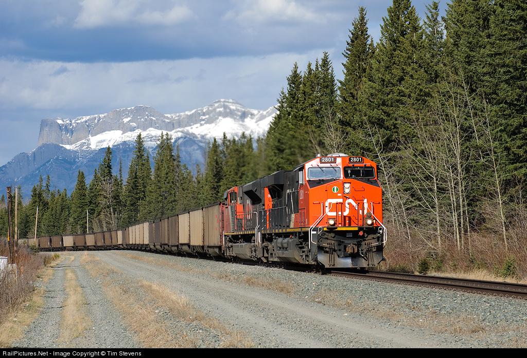 CN ES44AC 2801 and CN SD70M-2 8016 charge west on the Edson Sub with a coal train for Prince Rupert, BC.