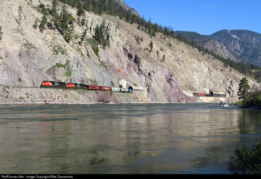 Westbound Canadian National manifest train No. 411 pases through the Skoonka Tunnels west of Spences Bridge, British Columbia, on July 23, 2011. A pair of SD70M-2s lead the train though the scenic Thompson River Canyon.