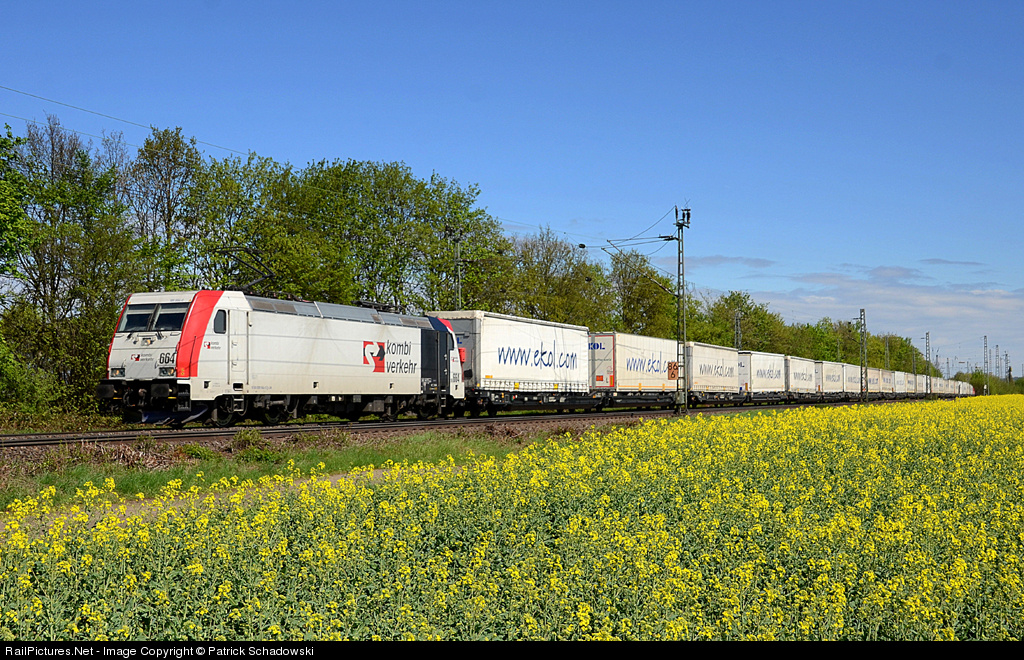 185 664 with the EKOL Intermodaltrain passing a rape field at Menden.