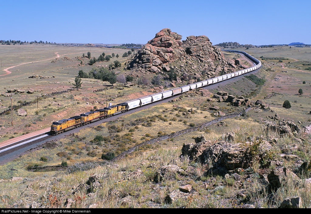 | A westbound Union Pacific unit potash train is approaching Dale Junction, Wyoming, on Sherman Hill on September 17, 2008. |
