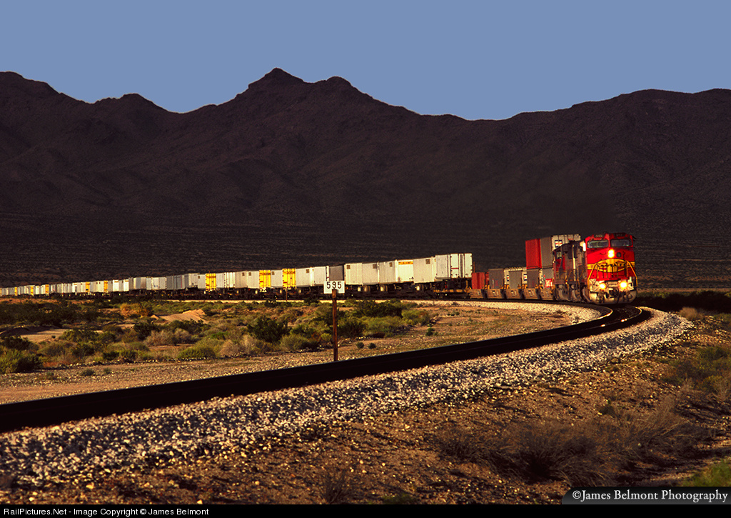 A hot Santa Fe intermodal climbs Goffs Hill through Bannock, California while the Dead Mountains loom in the shadows near the Nevada state line.