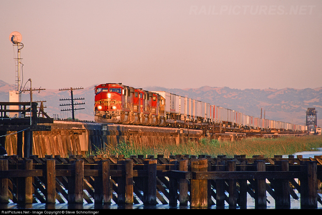 At sunrise, a long 991 train crosses the wooden trestle between the bridges at Orwood and Middle River at a restricted 5 mph.