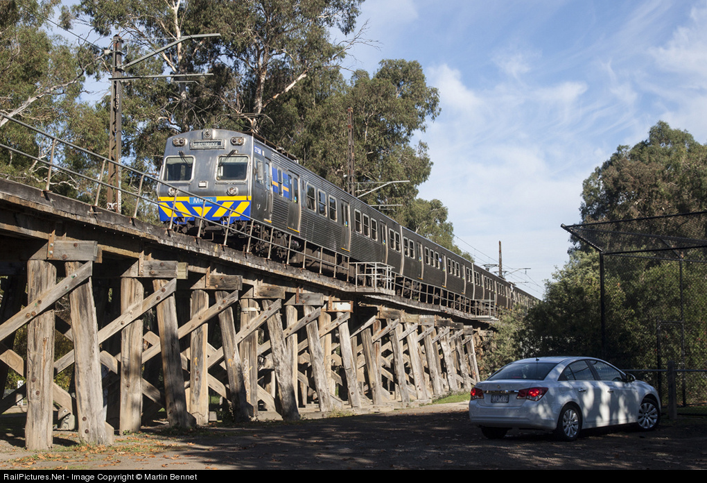 One of the few remaining Hitachi sets rolls across the Eltham Trestle Bridge with an off-peak run to Hurstbridge. For more info on this historic bridge see this video: http://www.youtube.com/watch?v=sJGYA0g7RT8