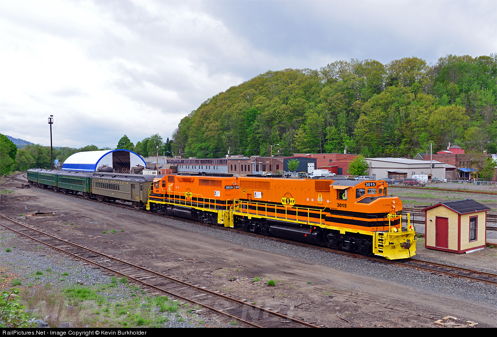 | New England Central GP40-2CU 3015 (GP40-2L) and GP40CU (GP40) 3809 are making an extremely rare appearance on the 'other side of the station' in White River Junction. Having hauled a National Train Day Passenger Extra into White River Junction on the opposite side (NECR) and discharging passengers, the train is now seen rolling up the Vermont Rail System's Washington County Railroad Bradford Subdivision on the way to spot the car of GMRC cars (for the White River Flyer) on the foreground track. |