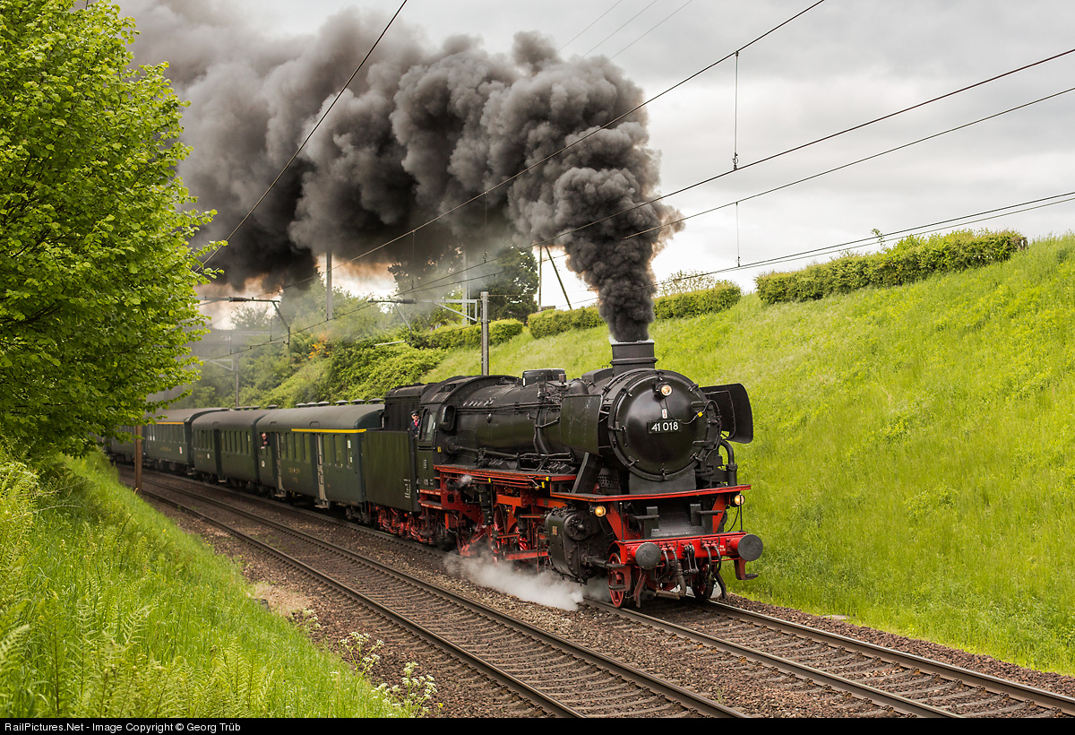 | Former Deutsche Bundesbahn (DB) steamlocomotive 41 018 (2-8-2), built by Henschel/Kassel in 1939 for the Deutsche Reichsbahn, is owned and operated today by Dampflokgesellschaft München e.V. and based in Augsburg. The heavy fuel oil fired "Mikado" is tackling the grade of 1.2 % up the "Möhlemerhöhe" between Möhlin and Mumpf on the Bözberg line. Train load is about 330 ton with two cars of Eurovapor Sulgen in front and 7 cars of the Swiss Classic Train (SCT) of William Cook Rail. |