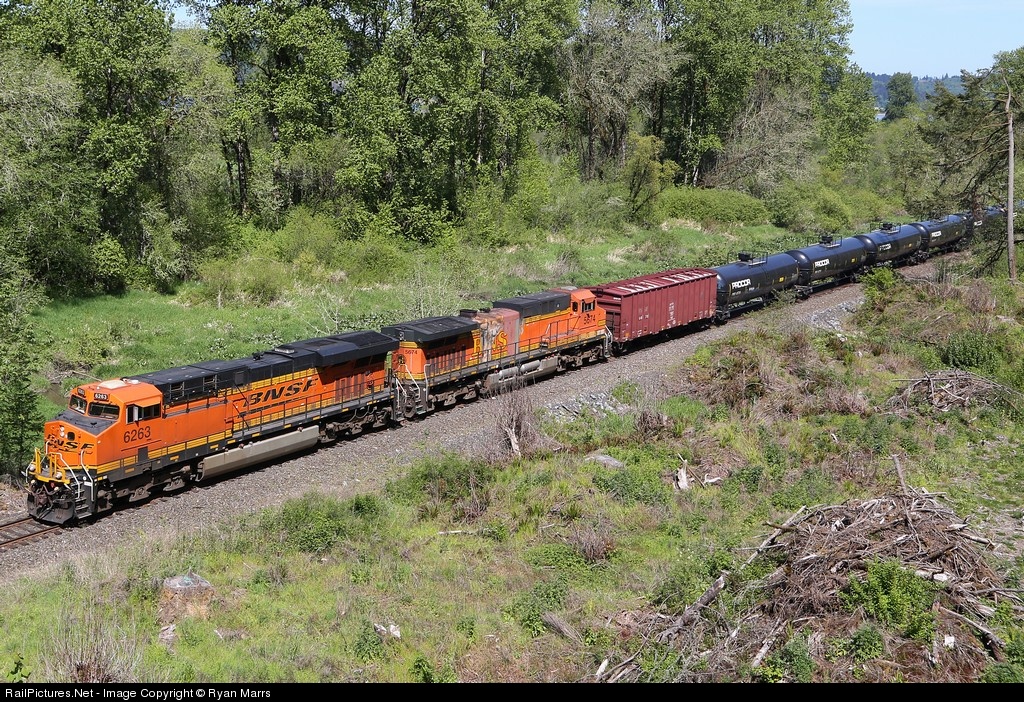 | BNSF #6263 leads a loaded oil train through Mayger. The train is bound for nearby Port Westward, where the oil will be loaded on barges and shipped to California. |