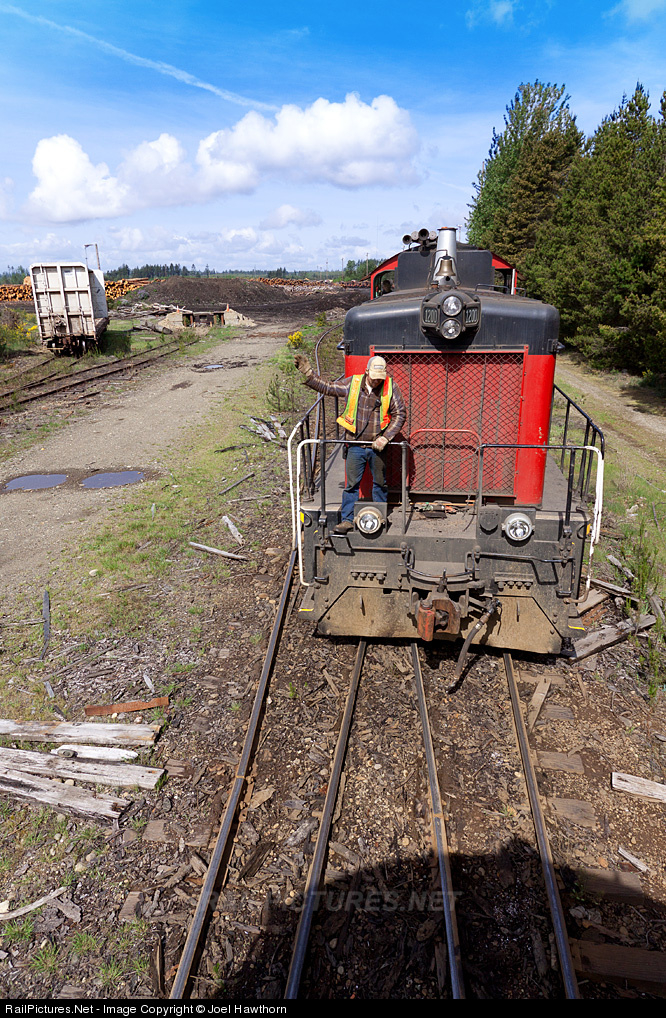 | At the vast dry sort facility located at the west end of the railroad a Simpson conductor guides the 1200 to a hook with the waiting 1202 after the train had delivered logs to be cold decked. Another engine, the 1201 will join us for the return trip to town as a light trio. |