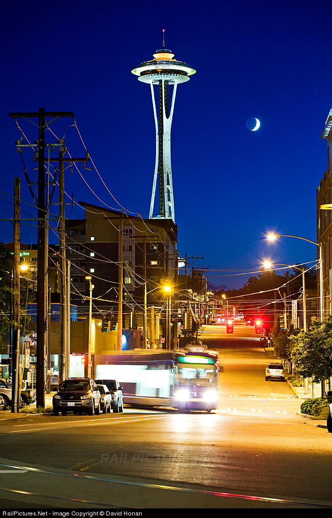 | An outbound Seattle Streetcar service swings around the corner from Westlake onto Thomas in Seattle's South Lake Union neighborhood. The iconic Space Needle dominates this blue hour scene, its roof having been repainted "Galaxy Orange" to match the original appearance of the structure during 2012's 50th anniversary celebrations. |
