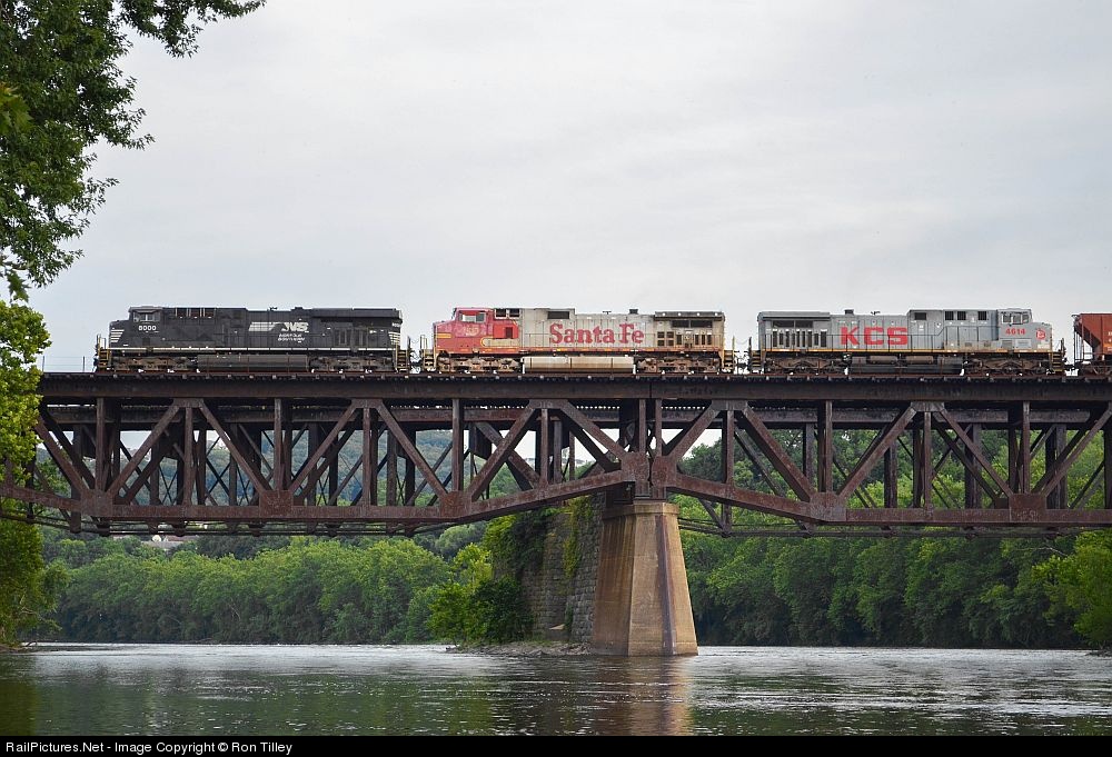 A wild lashup on an ethanol train bound for NJ is led by the Class Unit ES44AC #8000, a former Santa Fe Warbonnet, and a KCS AC4400. The train is seen crossing the Delaware River on the former CNJ bridge on a beautiful summer evening.